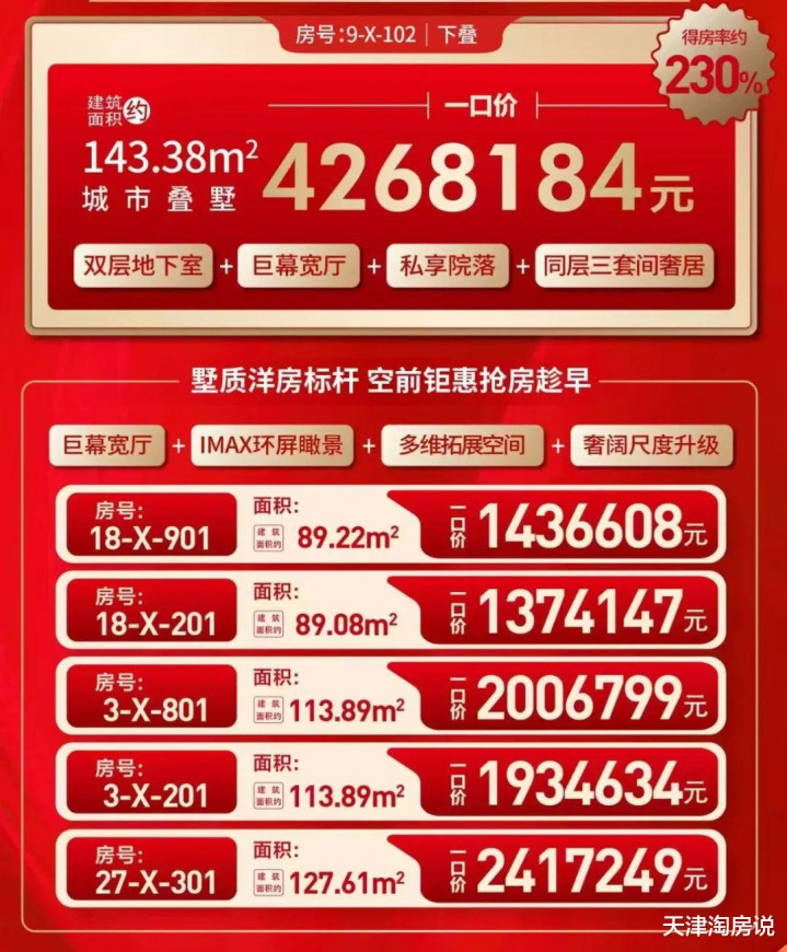 小高层面积为143平米,均价4.3-4.5万/平米;
